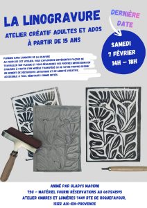 STAGE, ATELIER CREATIF LINOGRAVURE , à partir de 15 ans. SAMEDI 7 Février, de 14h à 18h., 75€ matériel fourni par l’atelier, pour réserver, contacter Gladys Macioni au 06 71 24 15 95.